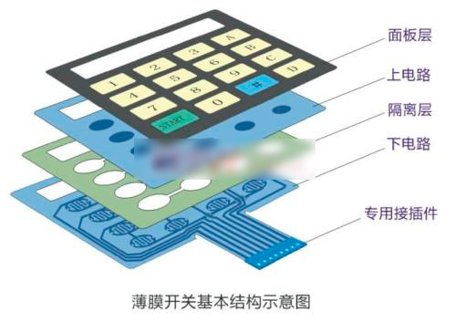 薄膜開關是集按鍵功用、指示元件、儀器面板為一體的一個操作系統(tǒng)。是選用PC,PET,F(xiàn)PC及雙面膠等軟性資料,運用絲網(wǎng)印刷技術制造而成的 多平面組合密封的集圖形、按鍵、標記符號顯示、導電及薄膜開關功用于一體的塑膠電子制品。廣泛應用于電子通訊、工業(yè)操控、醫(yī)療器械、汽車工業(yè)、儀器儀表、家用電器、兒童玩具、軍工設備等行業(yè)和領域。常見薄膜開關各部分組成原料: